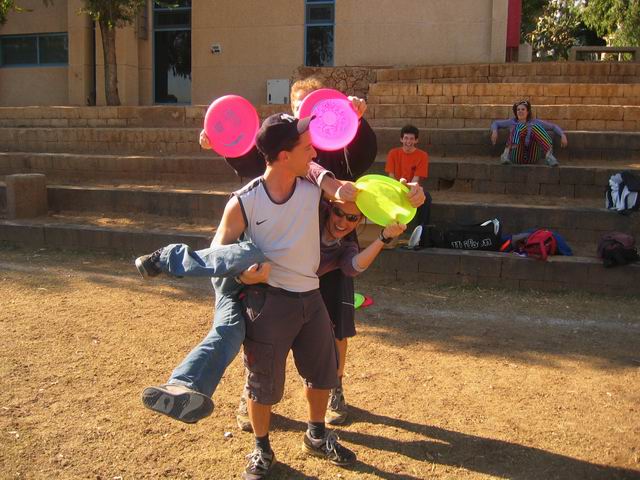מפחיד להבין כמה הגוף שלך מסובך ולתהות איך לעזאזל הוא ממשיך לעבוד כל הזמן. סוף סוף חלפה לה האנטומיה, ואחרי ארוחת בוהריים קצרה שבמהלכה תהתה אחת מעובריות הג'אז ,"פריסבי? מה כבר אפשר לעשות עם פריסבי?" מצאנו את החדר שלנו והתחלנו ברצינות. עשינו היכרות קצרה בין כולם, ומה כל אחד מצפה מהקורס. קיבלנו צלחות מיני ודורי העביר את מצגת "עקרונות הדרכת פריסבי". |