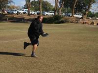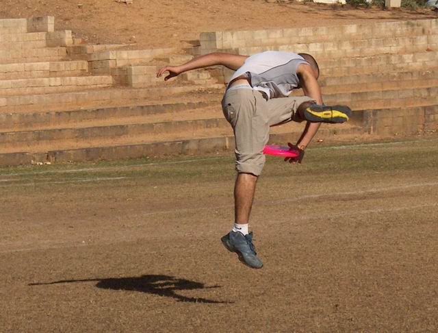 להגיד, כישרון טבעי. התרגיל שהיה הכי מוצלח נקרא "הקפריסבי". כמו בייסבול, רק עם צלחת. לקח איזה חצי שעה לגבש את הנוסחא המנצחת שכוללת לא יותר מדי תחנות, שורף אחד בקצה... משחק מוצלח מאד. במסגרת אחת הריצות, יקיר ניסה להגיע לתחנה והצליח להגיע אליה, להימרח עליה, ולמתוח משהו ביד שמאל. הפעם זה היה באמת רציני, הוא נרגע לשאר המפגש. |