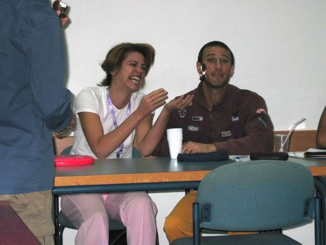 איתם קודם. דורי עלה על רעיון מבריק. במהרה, איתמר וניר מעיין העבירו לבנות תרגילי DOG (יש סרט). כולן נהנו מאד. עברנו מהר על שאר הדברים – דיוק (זריקה על שלט חף מפשע שהיה תלוי על הקיר בזמן הלא נכון), מרחק (יש לפגוע בקיר הרחוק של האולם)... TRC ו-MTA לא התקיימו עקב מזג האוויר הסוער. ברגע שסיימנו פרצו הבנות לאולם והתחילו לכדרר מסביב ברעש גדול. זה היה האות שלנו להתקפל. |