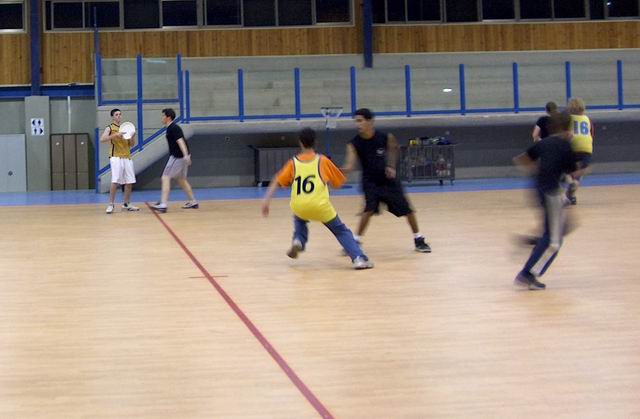 כלומר, זה המשחק הראשון שלנו כקבוצה! חשוב לציין גם שהאולם בסביון ממש אולם טוב...(למרות שחשבתי שכמו בכפר הרצפה חלקה וניסיתי לקפוץ לצלחת והנפילה קצת הרבה כאבה...חח) הצטלמנו בהתחלה כל קבוצת מכביה... וכל קבוצת סביון, באותו זמן עדי הלכה לעשות לעצמה בוק עם הקבוצה מסביון! היה דיי מצחיק... אני תופס פיקוד ומתחיל לרכז את הקבוצה (שוב אני מציין שבאנו הרבה... 5 ילדים), קודם כל רצנו ריצה קלה מסביב למגרש.... מתיחות.... קצת חימום עם צלחת... מסירות...קצת איזה תרגילון קטןנטן נחמד... וכו'... בערך בשעה 21:00 התחלנו בחימום אולטימייט - משחק מעורב של 2 הקבוצות.... שיחקנו בערך חצי שעה, לא יותר... היה נחמד... היה חביב... אני היתי בקבוצה עם לוסטי... והוא שאל ואתי על עידן... רק הבעיה שלוסטי לא ידע איך קוראים לעידן, ואז בא הכינוי החדש לעידן "השחור עם השחור", חחח כינוי ענק! |