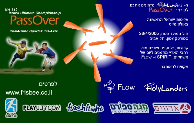 אליפות הארץ הראשונה באולטימייט תתקיים ב- 28/04/05 בספורטק ת"א ותאורגן ע"י קבוצת ה- HolyLanders, מייסדת הענף בארץ, ובשיתוף FLOW (ההתאחדות הישראלית לצלחות מעופפות).